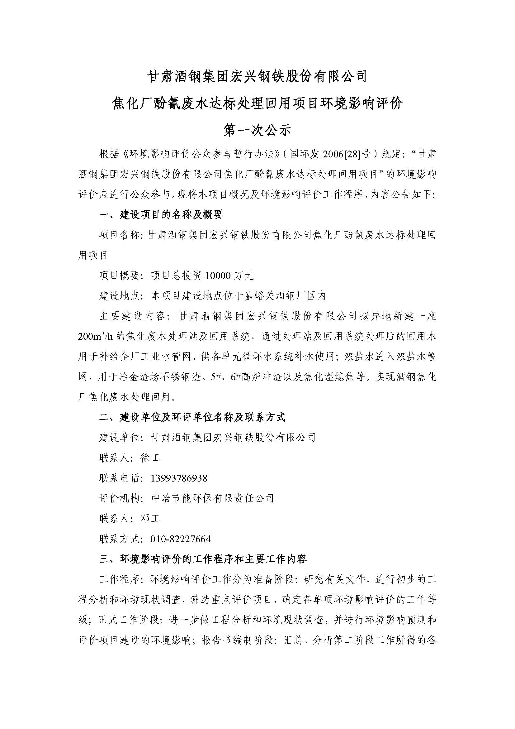 甘肅酒鋼集團(tuán)宏興鋼鐵股份有限公司焦化廠酚氰廢水達(dá)標(biāo)處理回用項(xiàng)目環(huán)境影響評(píng)價(jià)第一次公