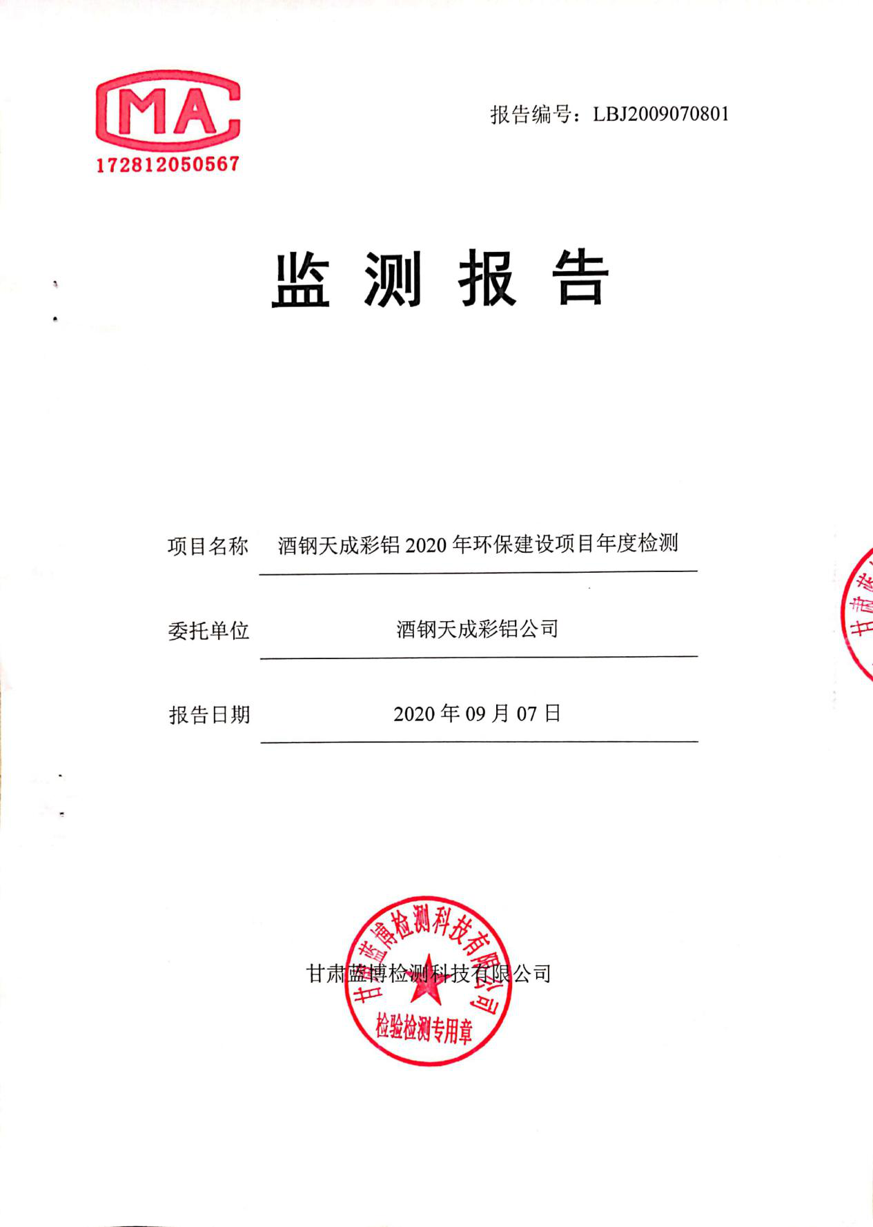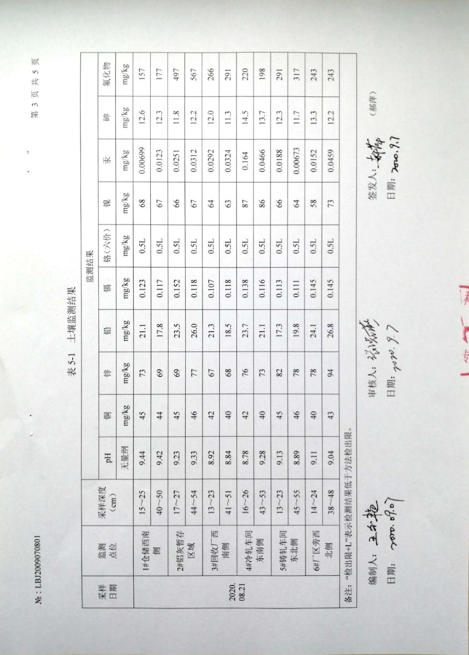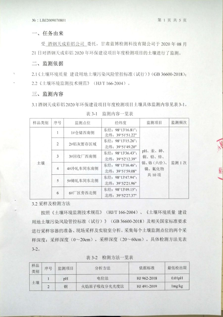 監(jiān)測(cè)數(shù)據(jù) 詳見(jiàn)甘肅酒鋼天成彩鋁有限責(zé)任公司2020年土壤環(huán)境檢測(cè)報(bào)告,批號(hào):LBJ2009070801