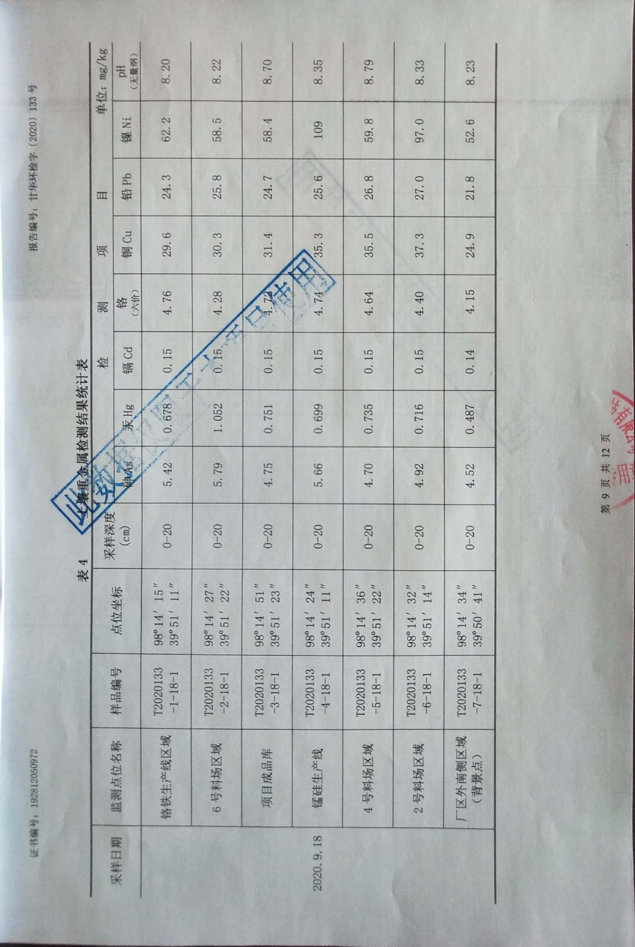 | 監(jiān)測時間 | 2020年9月18日 | 監(jiān)測項目 | PH、鎘、汞、砷、銅、鉛、鉻、鎳、鋅、陽離子交換量 | |