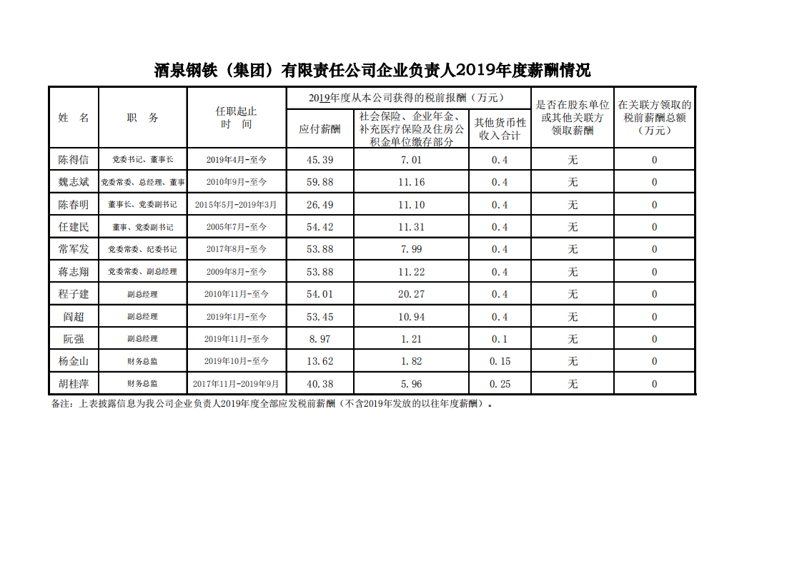 酒泉鋼鐵(集團)有限責(zé)任公司企業(yè)負責(zé)人2019年度薪酬情況