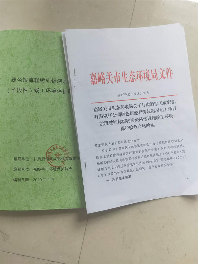 我公司環(huán)境影響報(bào)告書均通過省生態(tài)環(huán)境廳與市生態(tài)環(huán)境局審批,于2016年11月2日取得《嘉峪關(guān)市環(huán)境保護(hù)局關(guān)于酒鋼天成彩鋁有限責(zé)任公司綠色短流程鑄軋鋁深加工項(xiàng)目環(huán)境影響報(bào)告書的批復(fù)》嘉環(huán)評(píng)【2016】132號(hào)。并在2019年3月4日通過環(huán)保建設(shè)項(xiàng)目“三同時(shí)”(階段性)驗(yàn)收,并取得環(huán)境保護(hù)驗(yàn)收合格函。
