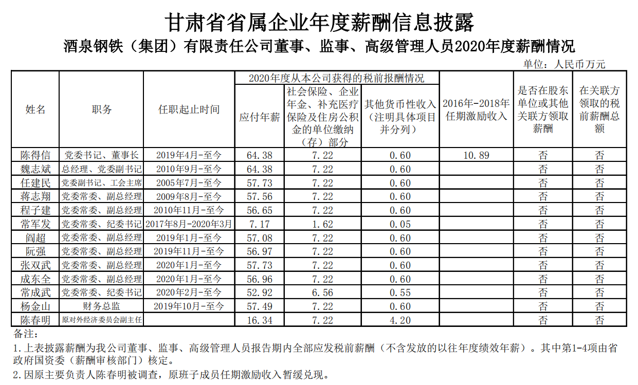 酒泉鋼鐵(集團(tuán))有限責(zé)任公司董事、監(jiān)事、高級(jí)管理人員2020年度薪酬情況