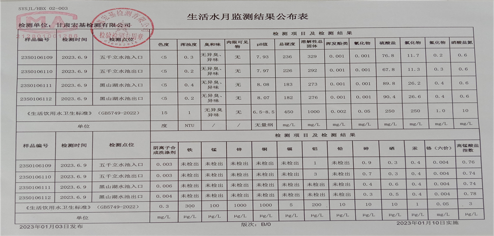 甘肅潤(rùn)源環(huán)境資源科技有限公司水源地水質(zhì)2023年第二季度公示